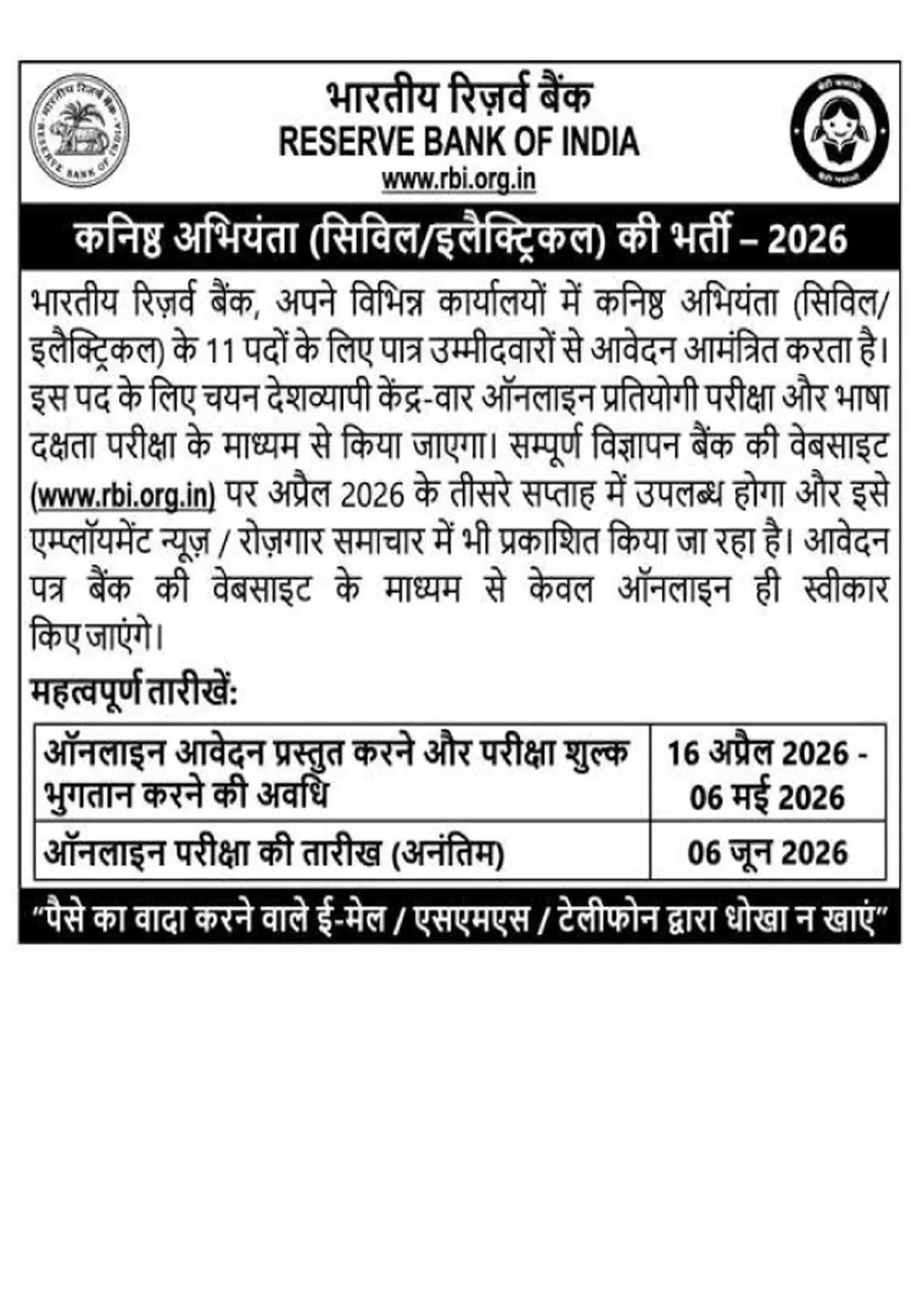 The Reserve Bank of India (RBI) has announced the Junior Engineer (JE) Civil / Electrical Recruitment 2026, creating a promising new job vacancy opportunity for engineering diploma holders. This recruitment is especially beneficial for candidates seeking a secure government job. The online application process for RBI JE Recruitment will be open from 16th April 2026 to 6th May 2026.